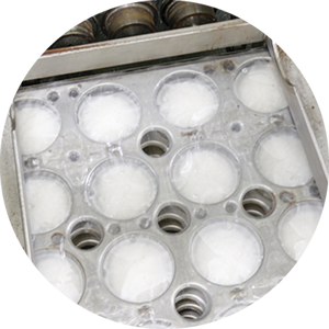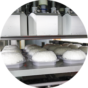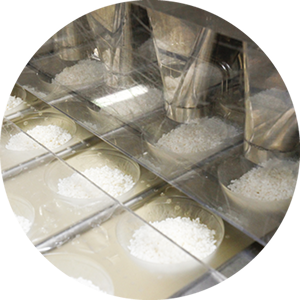 「日本のごはん」は100度超に熱しても大丈夫なポリプロピレン容器を使っています。単一素材で、ふたも圧力で密閉する方式です。接着剤を使わないため、いやな「臭い」が出ることもありません。また、パック容器に直接お米と水を注ぎそのまま炊き上げるので、ごはんの移し替え工程も必要ありません。越後製菓の「日本のごはん」は、異物や細菌が混入するリスクを徹底的に抑えて炊き上げています。