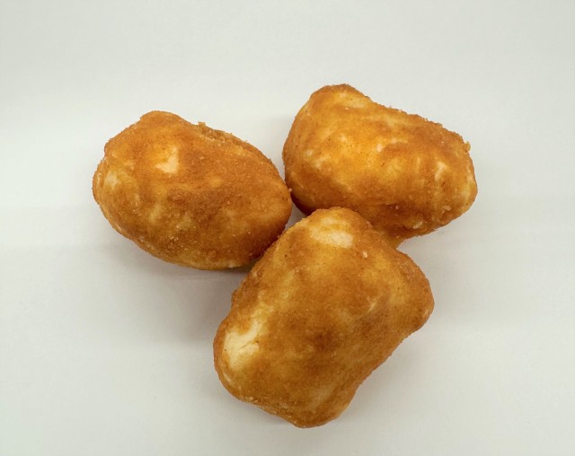 揚げているのではなく、生地を焼いて、味付けパウダーを定着させるために外側につけています。
