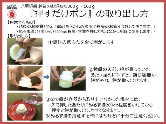 大変申し訳ございませんでした。お手数ですが、容器の天部からぬるま湯をコップ一杯分をお掛け下さい。容器から餅がはがれます。