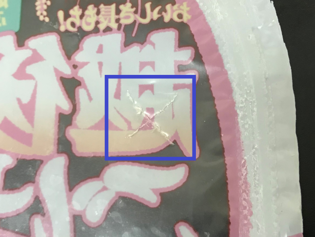 弊社のパックごはんはトレーにお米と水を入れて透明なフィルムで包装した後、パックごと炊飯しています。炊飯する際、蒸気の抜け口として透明なフィルムに切り込みを入れています。炊飯後は透明なフィルムの上からフタフィルムを包装して密封しています。切り込みは製法上の特徴ですので、品質に影響ございません。ご安心ください。尚、切り込みの形状や位置は製造ラインによって異なります。