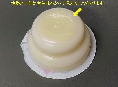鏡餅容器に餅を入れる際、容器と餅の間に気泡(わずかな空洞)が生じることがあり、この気泡によって天部が黄色味がかって見えることがありますが、品質に異常はありません。ご安心ください。