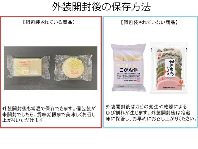 個包装されているお餅は、外装開封後も常温で保存できます。個包装されていないお餅は、外装開封後は冷蔵庫に保管していただき、お早めにお召し上がりください。