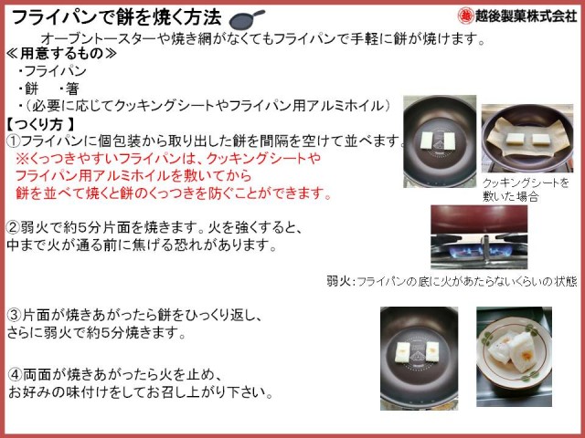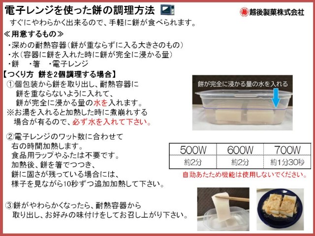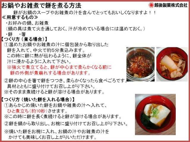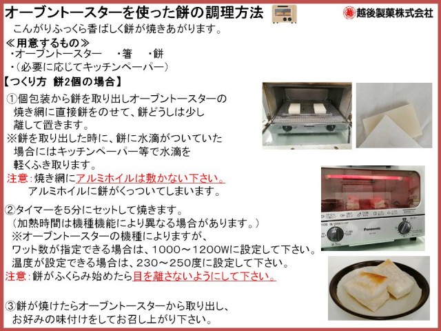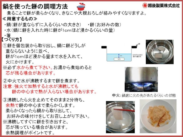 お鍋で煮る・オーブントースター・電子レンジの調理方法は下記の通りです。調理された餅は熱くなっておりますので、『やけど』に注意してお召し上がりください。