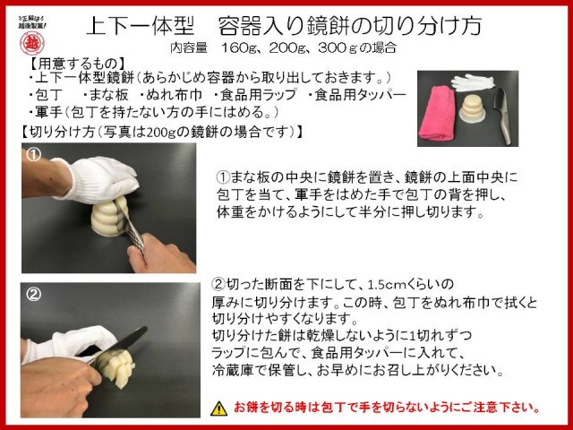 大小2段重ねの鏡餅の形をしたプラスチック容器の中に容器の形状そのままのお餅が入っている商品です。充填タイプとも言います。鏡餅容器は開封せずにそのままお飾りください。お召し上がりの際には、鏡餅容器を開封し、お好みの大きさに切り分けてください。