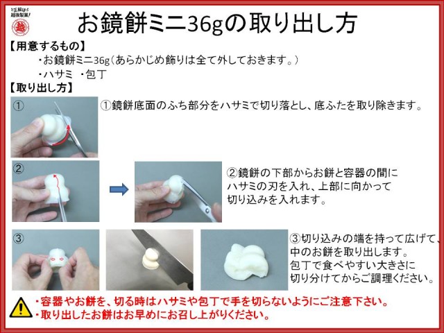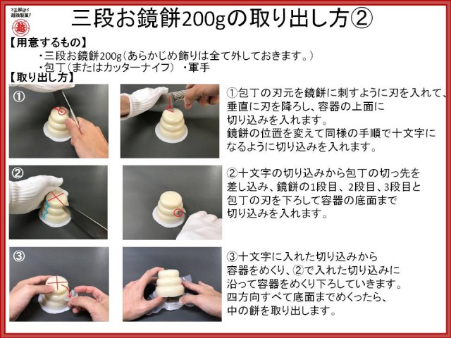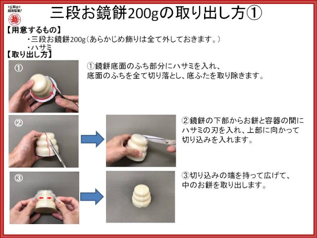 底ふたのふちを切り落とし、鏡餅容器の底部から切り開く方法と鏡餅容器の天部から底まで切り込みを入れて取り出す方法があります。