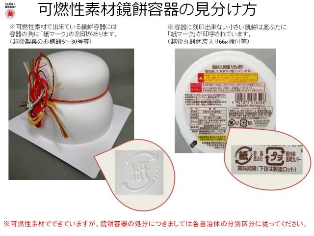 可燃性素材で出来ている鏡餅容器には容器の角に「紙マーク」の刻印があります。(越後製菓の鏡餅5~30号等)、容器に刻印出来ない小さな鏡餅には底ふたに「紙マーク」が印字されています。(越後丸餅個装入り66g橙付等)