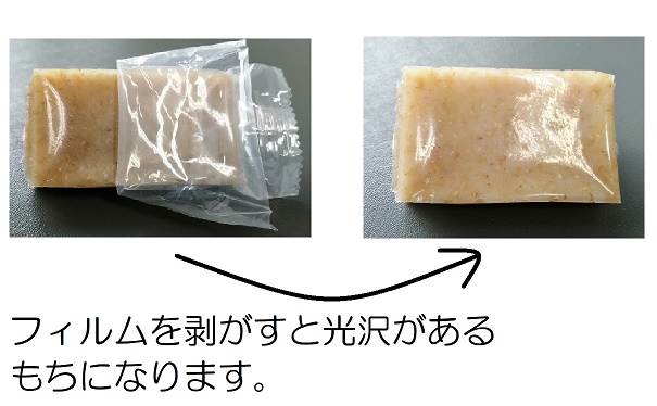 餅をフィルムに入れてから熱処理を行っています。フィルムと餅が熱で密着することにより、餅表面がピカピカする現象です。包装フィルムを1枚剥がすと餅そのものですので、そのまま調理してお召し上がりください。