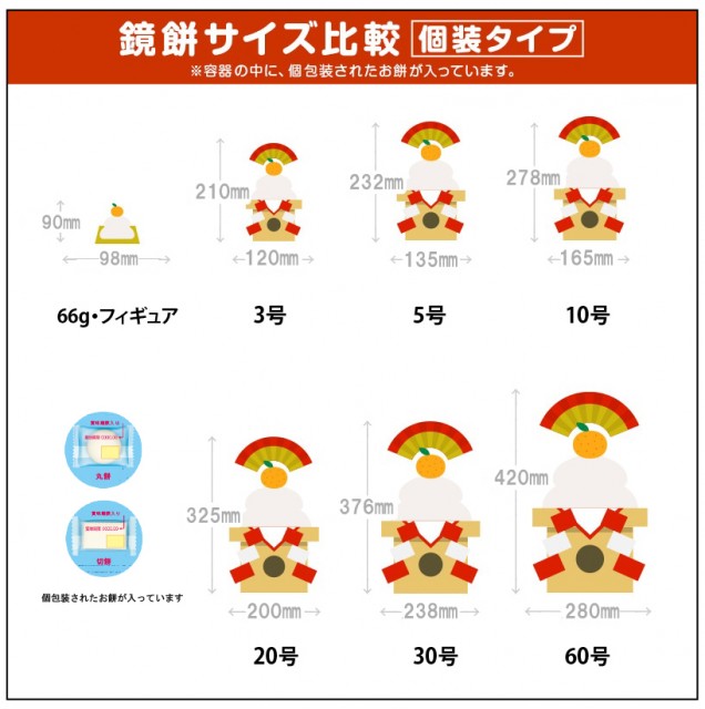 上下一体型の鏡餅3.2kgと鏡餅2kgの一般販売は終了致しました。長い間、ご愛顧頂きありがとうございました。上下一体型の鏡餅とほぼ同サイズの個装入鏡餅がございます。