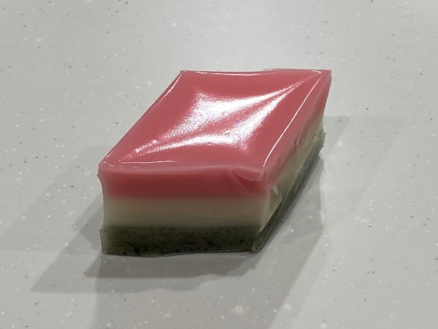 「ひしもち」は、包装後の熱処理により桃色、白色、緑色の3枚のお餅がくっついています。お召し上がりの際は、色の境目から包丁を入れると、1枚ずつはがれます。その後、お好みの調理方法でお召し上がりください。