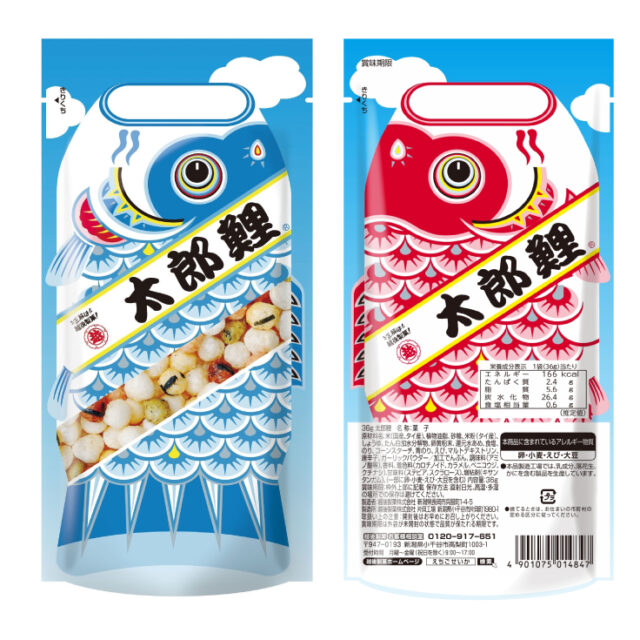古くから幸福を願う色として伝わる5色を海老、醤油、のり、青のり、マヨネーズ味のあられで表しました。澄み切った大空を悠々とおよぐこいのぼりのように健やかなお子様のご成長を願ってお届けします。大空をおよぐこいのぼりをイメージし、パッケージの表面には青い鯉、裏面には赤い鯉をデザインしています。