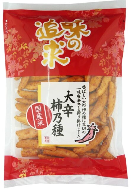 国内産のお米を使用し、香ばしく焼き上げた大粒柿の種に、荒切の一味唐辛子を振り掛けました。