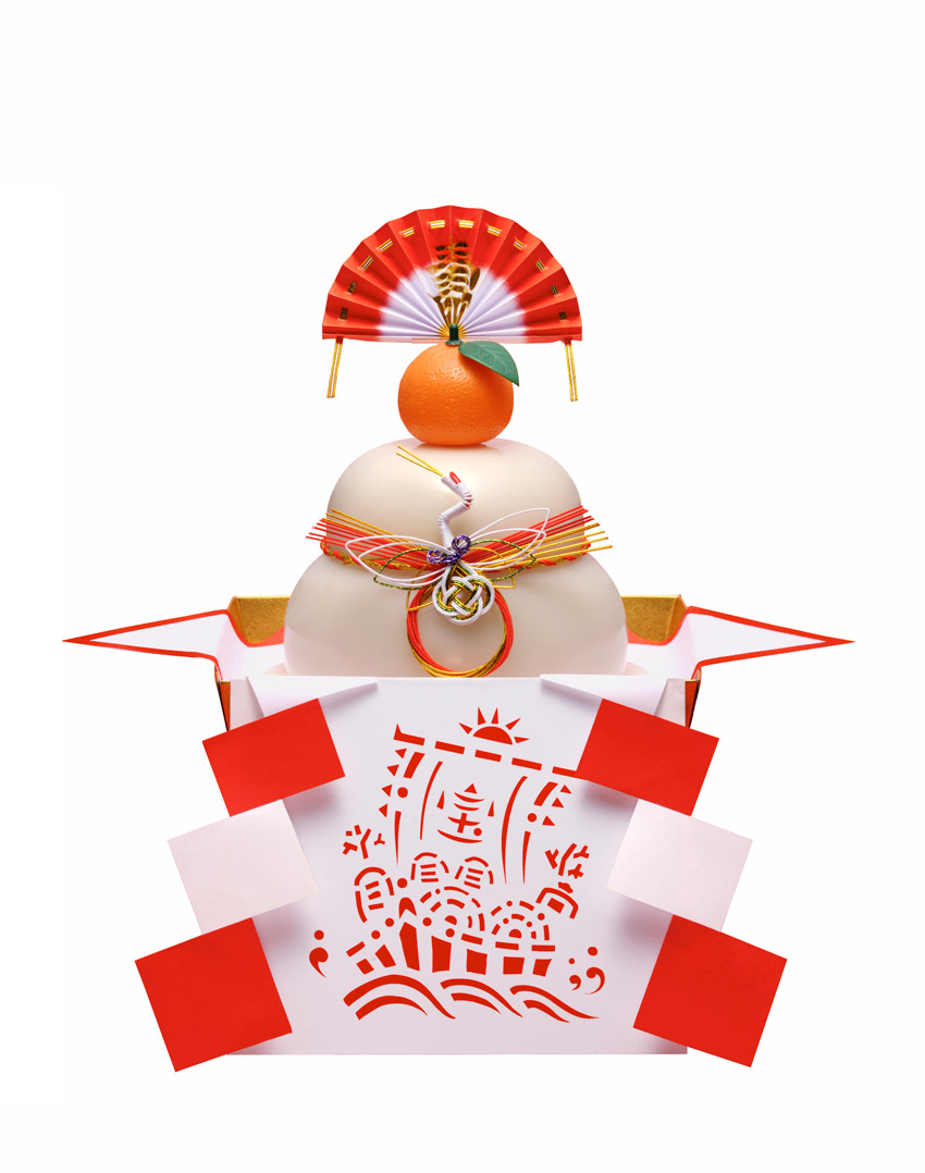 鏡開きにおもちが簡単に取り出せる容器です。 開封時にナイフ等で切り開かずにおもちを取り出すことが出来ます。底フタをはがし、容器の底部のつまみを左右に開くと、おもちが「ポン」と出せます。ジャストサイズの橙付でお飾り楽楽です。 ※末広・橙・水引・奉書・敷紙・しで・三方が付いています。