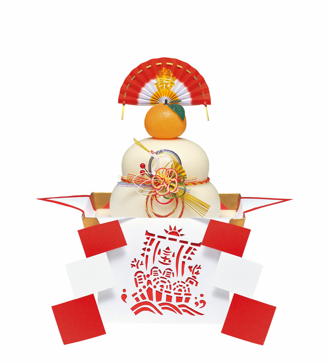 光沢のある容器にお餅を充填した、重量感のあるお鏡餅です。ジャストサイズの橙付でお飾り楽楽です。 ※末広・橙・水引・奉書・敷紙・しで・三方が付いています。